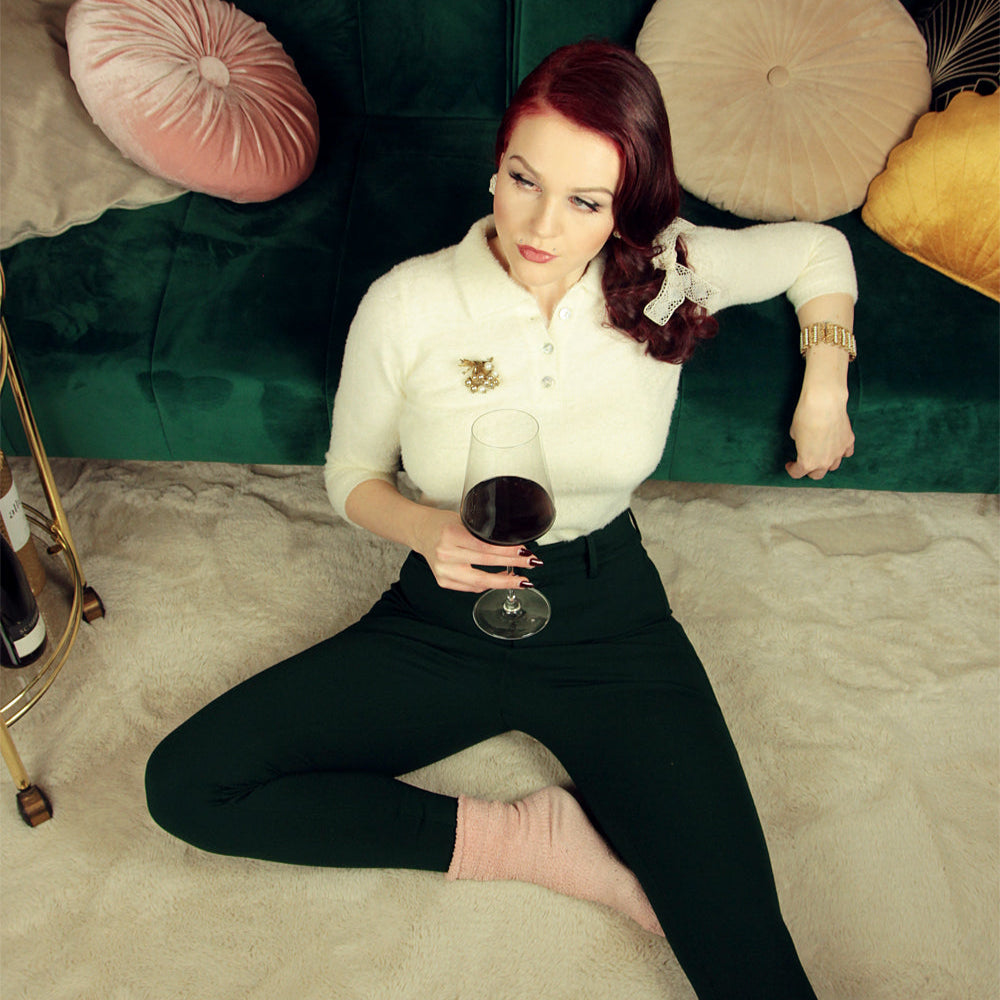 The fit is excellent on all body types. The soft spun material feels ultra-luxurious and fits the curve of your body perfectly. Our Glenda pullover cropped sweater is very stretchy, soft to the touch, and comfortable! The top-notch construction of the Glenda sweater includes a 3/4 length sleeve, three functioning shell buttons leading to a trim little fold down collar.